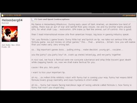 Dramatic Reading - F1 Cars and Spent Contraceptives - Heisenberg Milankovic - Cars And Spent Contraceptives - Dramatic reading of a post of Codemasters' F1 forums.The full thread can be found here: ...